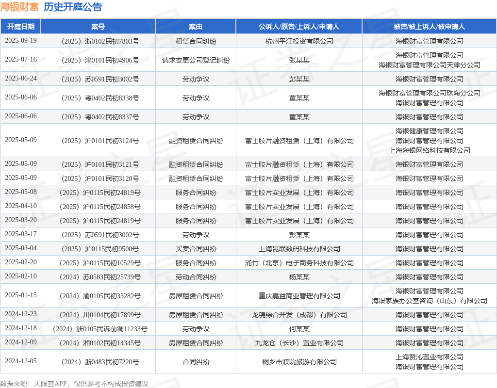 案号:(2025)津0101民初4906号审理法院:天津市和平区人民法院案由:请求变更公司登记纠纷当事人信息: 原告/上诉人:张某某 被告/被上诉人:海银财富管理有限公司、海银财富管理有限公司天津分公司开庭日期:2025年7月16日根据统计,近一年内以海银财富管理有限公司为当事人的历史开庭公告有58则,其中案由为“劳动争议”的公告以31则居首,其次为“房屋租赁合同纠纷”有5则,“服务合同纠纷”有5则。历史开庭公告(前20条)如下:
